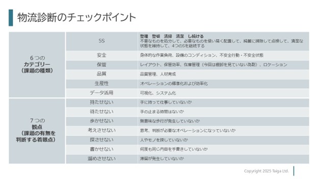 物流現場の課題を網羅的かつ整理された状態で抽出すべく、6つのカテゴリー×7つの観点で整理されたチェックポイントを適用しました。