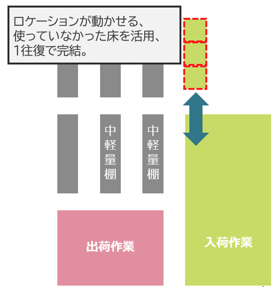 ロケーションと担当の分担を整理し、ピッキングリストの順番を最適化することで効率を上げられる余地が大きい。