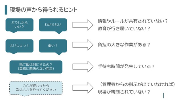 現場での会話の内容から、例えば次のようなヒントを得て、これらと、実際の現場での人の動きや、レイアウトや保管の様子、生産性の状況といった、見た目や数値に現れる情報とを合わせて考察して、課題の有無を判断していきます。