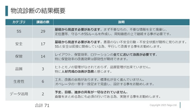 2日間の物流診断の結果、課題が顕在化しているファクト(数値化されたデータや、写真や動画で示される状態)として70個強の項目を提示させていただきました。